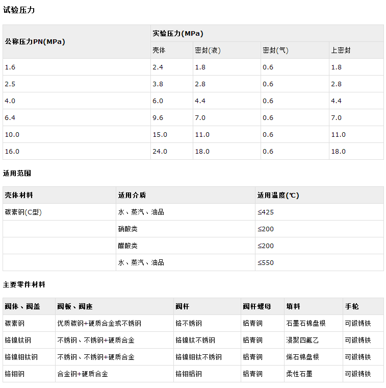 結構型式:彈性楔式單閘板、剛性楔式單閘板和雙閘板型式。 廣泛適用于石油化工,火力發電廠等油品、水蒸汽管路上作接通或截斷管路中介質的啟閉裝置。 主要性能規范