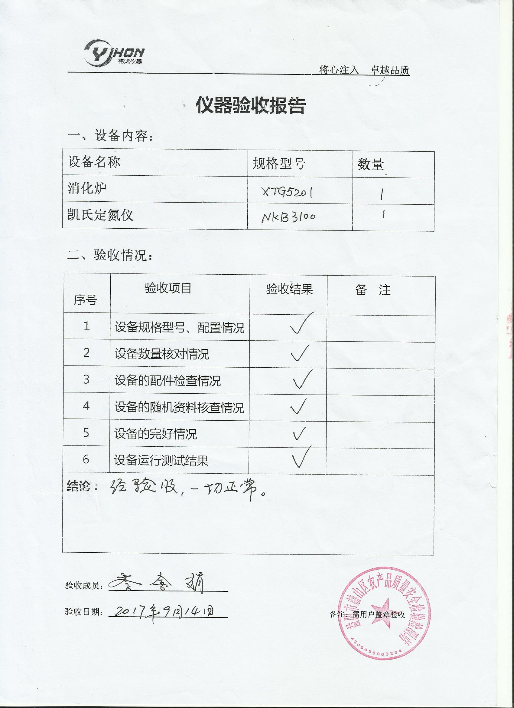 湖南益陽赫山農業局位于洞庭湖區魚米之鄉益陽,單位主要提供農業技術指導等工作。近期選擇上海祎鴻定氮儀NKB3100,XTG5201消解儀,對土壤等樣品的氮含量檢測,9月底順利驗收合格。