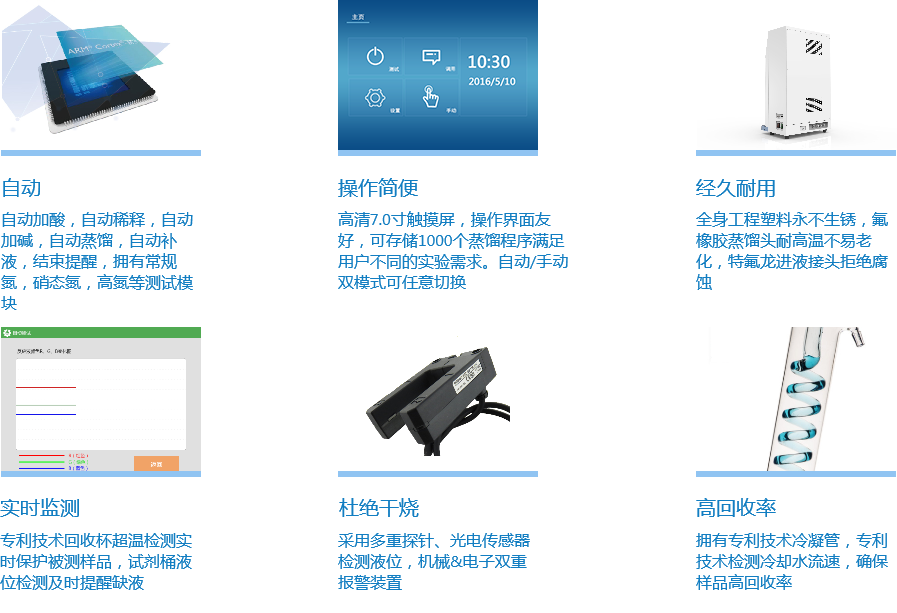自動化程度 參數設定后,儀器自動完成品加酸、稀釋、加堿、蒸餾、吸收及管路淋洗