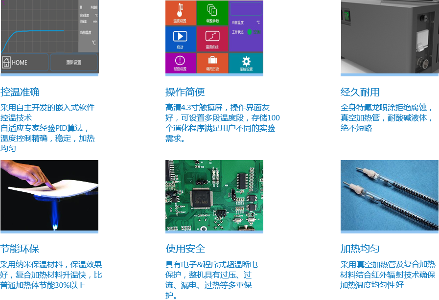 XTG5081紅外消解儀采用電熱絲復(fù)合真空加熱技術(shù),升溫效率高,溫度均勻性好。采用行業(yè)領(lǐng)先的納米云隔熱材料,熱效率高,節(jié)能環(huán)保。更具有4.3寸高清LCD觸摸屏操控界面,簡單易懂,并具實時顯示溫度曲線功能,摒棄了以往溫控表頭繁瑣的操作。